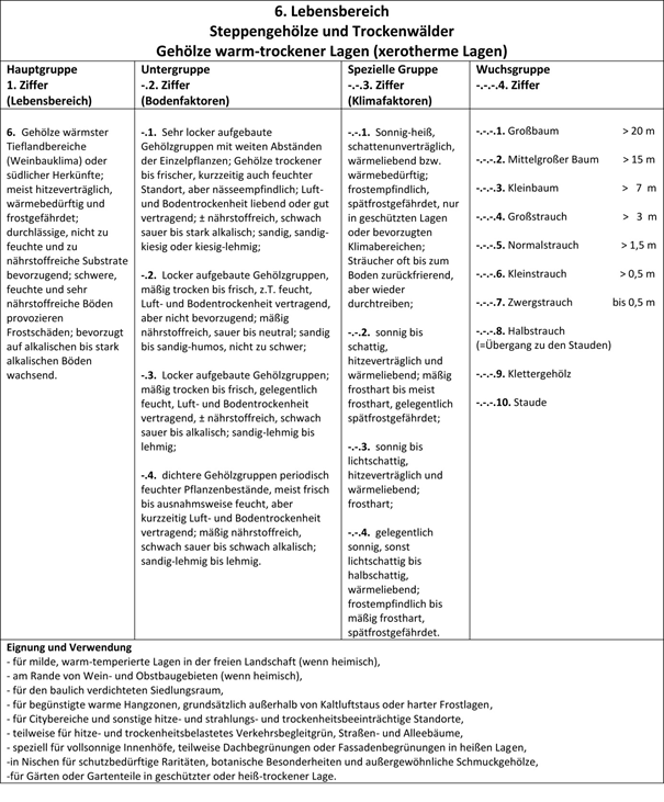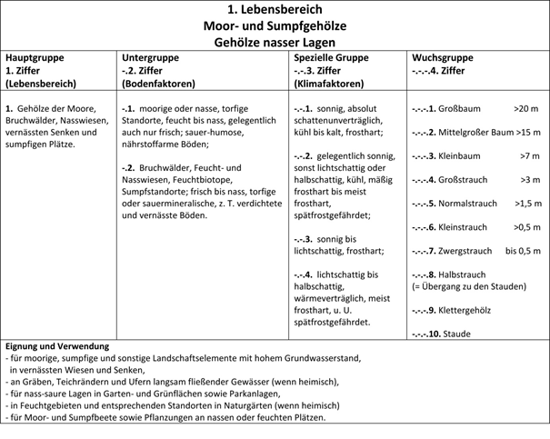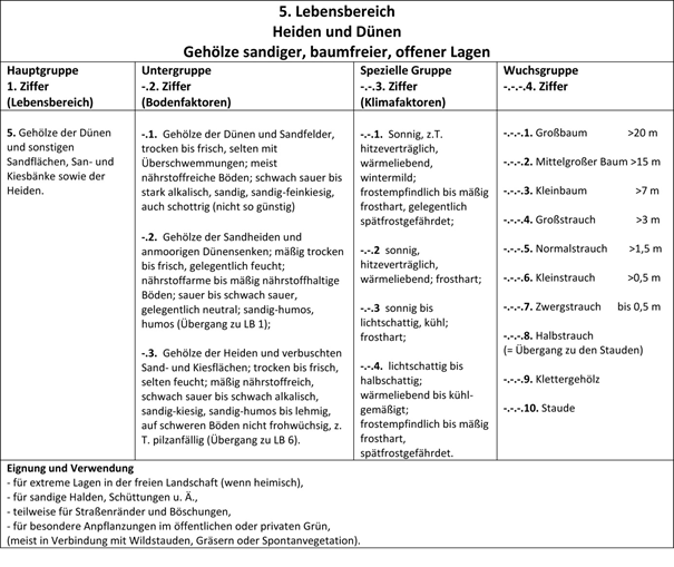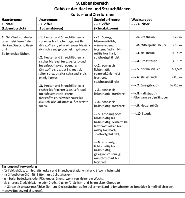 Eine Einteilung nach Lebensbereichen kann nur diejenigen Faktoren berücksichtigen, die zum Überleben oder besseren Gedeihen der Gehölze notwendig sind. Ausgeklammert werden müssen alle optischen Signale (Blüten, Farben usw.), Duft und pflanzlichen Details (Blattbehaarung, Zweigstellung u. Ä.) der Gehölze, da diese ein solches Kennziffernsystem überfrachten und unklarer machen würden.