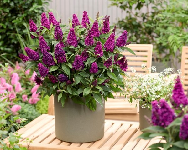 Buddleja davidii Butterfly Candy Little Magenta überzeugt mit großen, violett-roten Blütenständen und einem angenehmen, süßlichen Duft. Die kompakte, rundliche Pflanze erreicht eine Höhe und Breite von ca. 80 cm und ist besonders attraktiv für Schmetterlinge und Bienen. Sie bevorzugt vollsonnige Standorte sowie durchlässige, nährstoffreiche Böden. Durch ihren dichten, gut verzweigten Wuchs eignet sich Little Magenta ideal für kleinere Gärten und Pflanzgefäße. Winterhart bis –18 °C. B, H, K, S, Z. Zone 6. EU Sortenschutz 20231782. Geschützte Sorte – Vermehrung verboten!