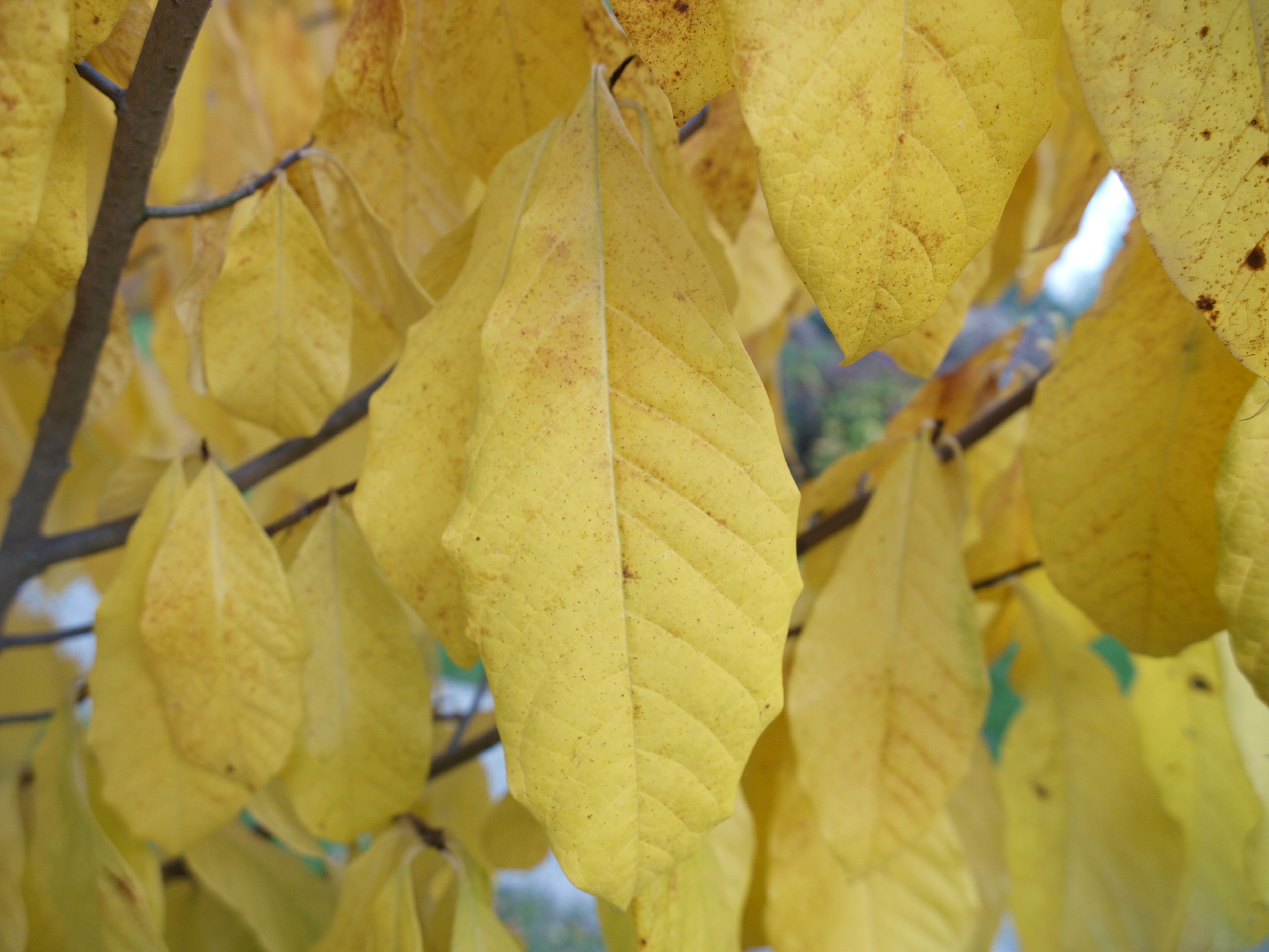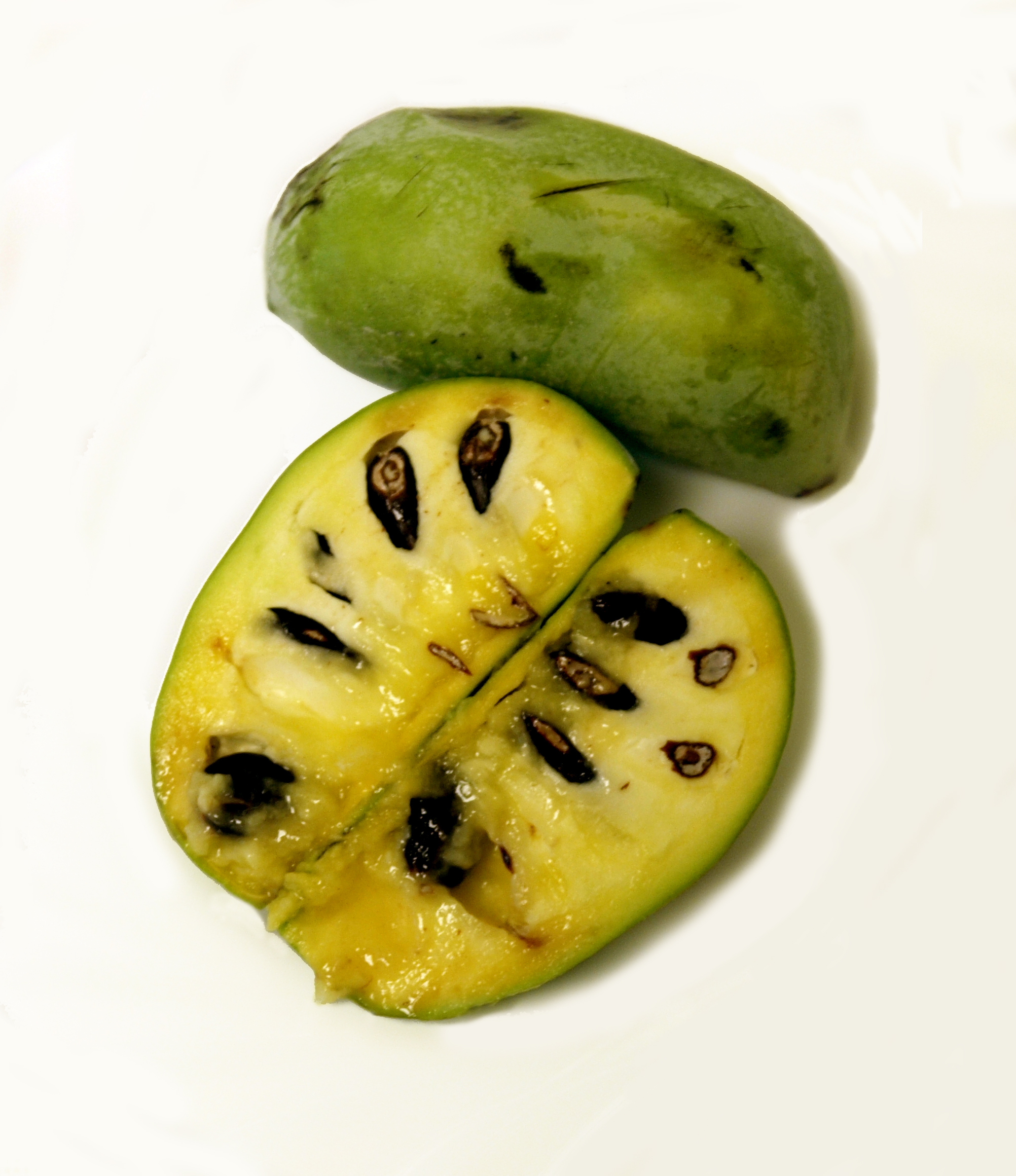 Bis 12 m hoher, in Kultur meist niedrig bleibender Baum oder Strauch; Triebe zunächst rostbraun behaart, später kahl und glänzend braun; Blätter verkehrteiförmig, 15–25 cm lang, oberseits tiefgrün, unterseits hell graugrün und anfangs stark behaart, fein durchscheinend punktiert; Blüten 3–4 cm breit, glockig, einzeln, nickend, auf dicken, rotbraunen Stielen, die äußeren Kronblätter braunrot bis purpurn, die inneren kleiner und gelb gestreift, Staubblätter purpurn, im April–Mai, vor oder mit der Laubentfaltung; Früchte beerenartig, 5–15 cm lang, meist zu 3 in Quirlen, anfangs grünlich gelb, zur Reife gelbraun, Fruchtfleisch weich, süß und aromatisch, Reifezeit im September-Oktober – durch Habitus und Belaubung ein elegantes Fruchtgehölz mit hohen Erträgen in sommerwarmen Klimazonen; wird in den Südstaaten der USA schon lange erwerbsmäßig angebaut; einziger winterharter Vertreter der Familie der Rahmapfelgewächse. S. Zone 6b. LB 2.3.1.4.