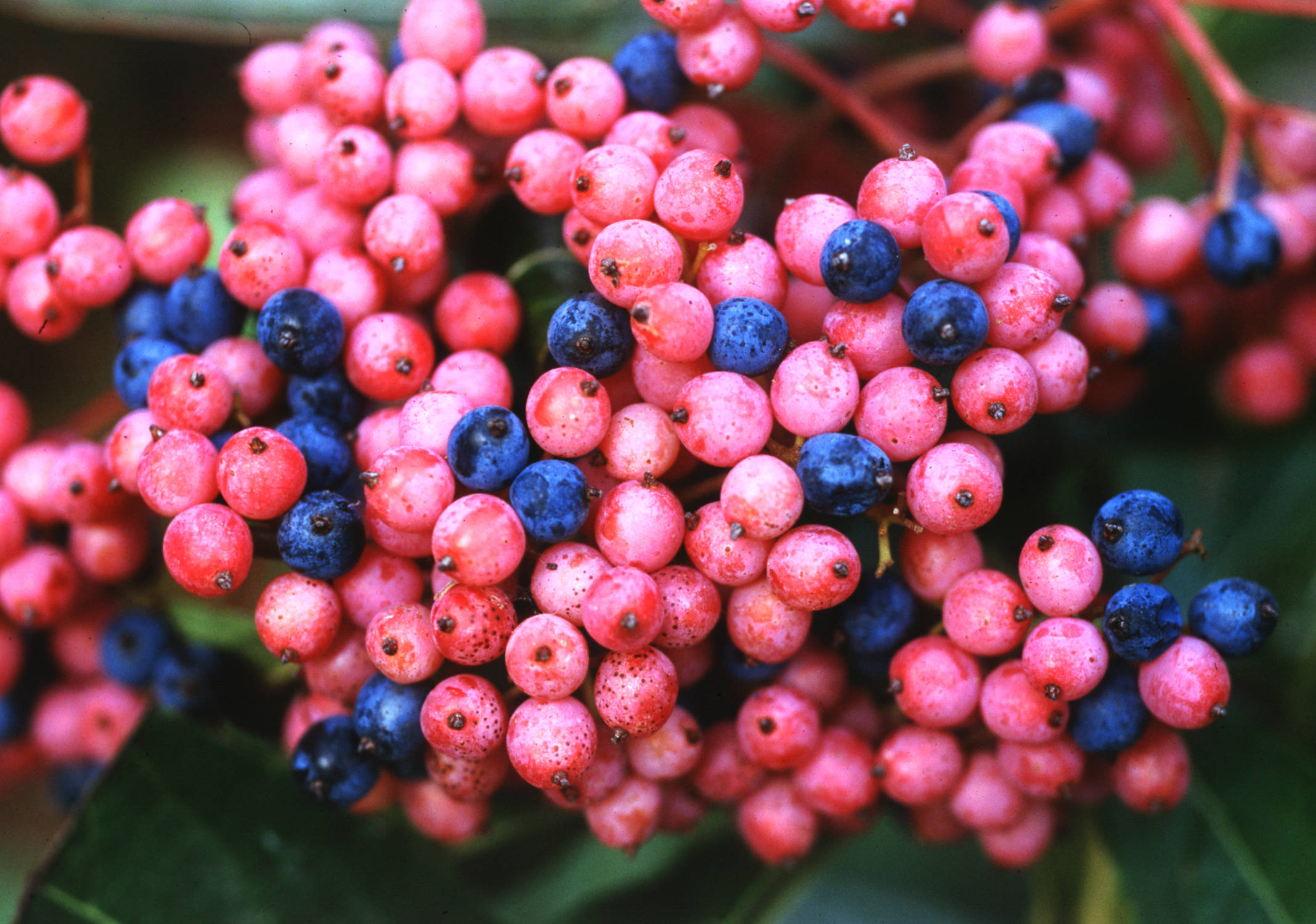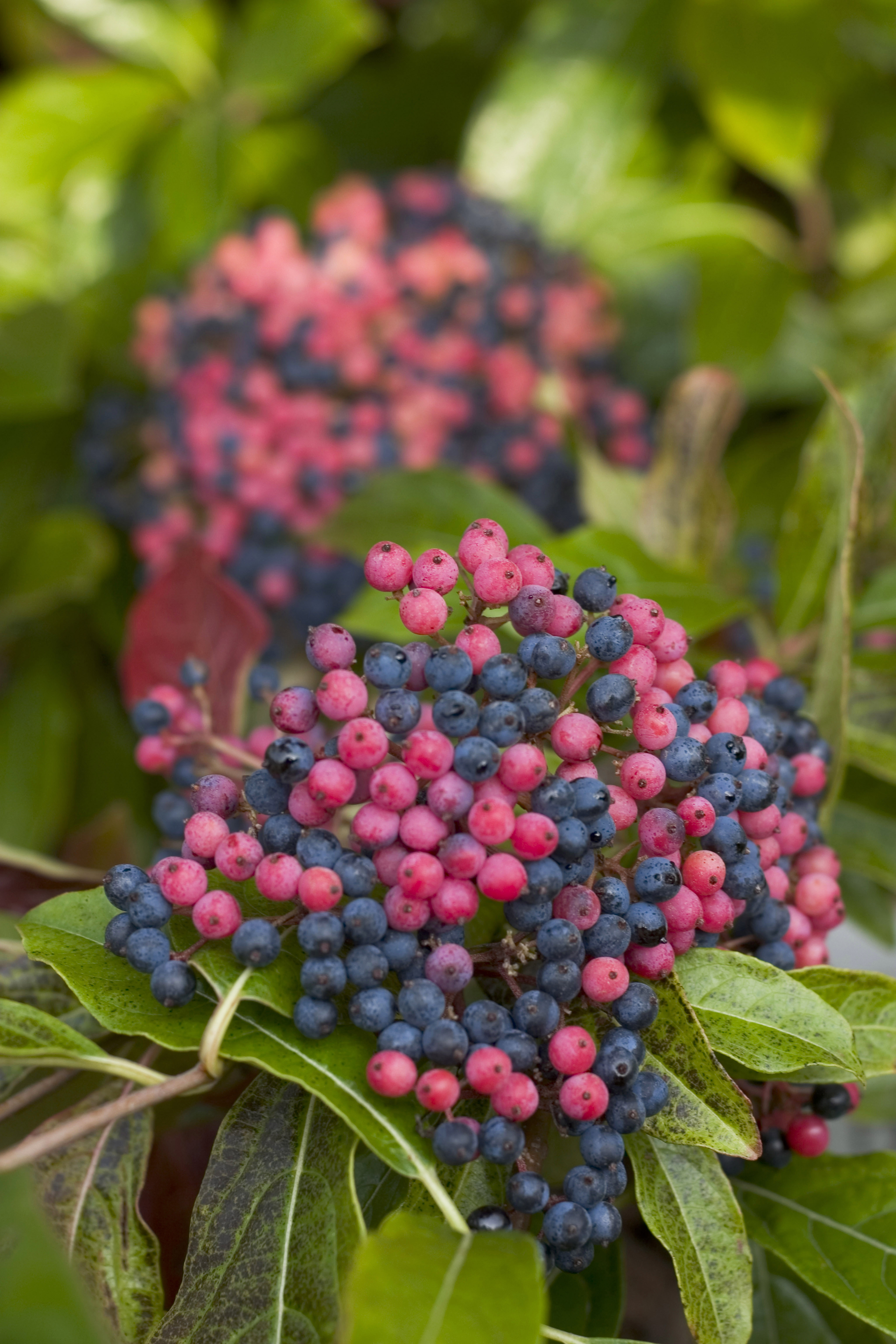 Bis etwa 1,5 m hoher, breit aufrechter Strauch; Blätter 8–15 cm lang, elliptisch oder lanzettlich, dunkelgrün, im Herbst attraktiv dunkel rotbraun; Blüten gelblich weiß, in 10 cm breiten Trugdolden, Juni; Früchte mit spektakulärer Färbung, sie entwickeln sich von grün zu strahlendem rosa und blau – bemerkenswerter Schneeball mit hohem Zierwert durch kontrastreiche Fruchtstände und attraktive Belaubung, außerordentlich winterhart und selbstfruchtend. H, K, S. Zone 5b. LB 1.2.4.5. Deutsche Marke 302008034121. Sorte markenrechtlich geschützt!