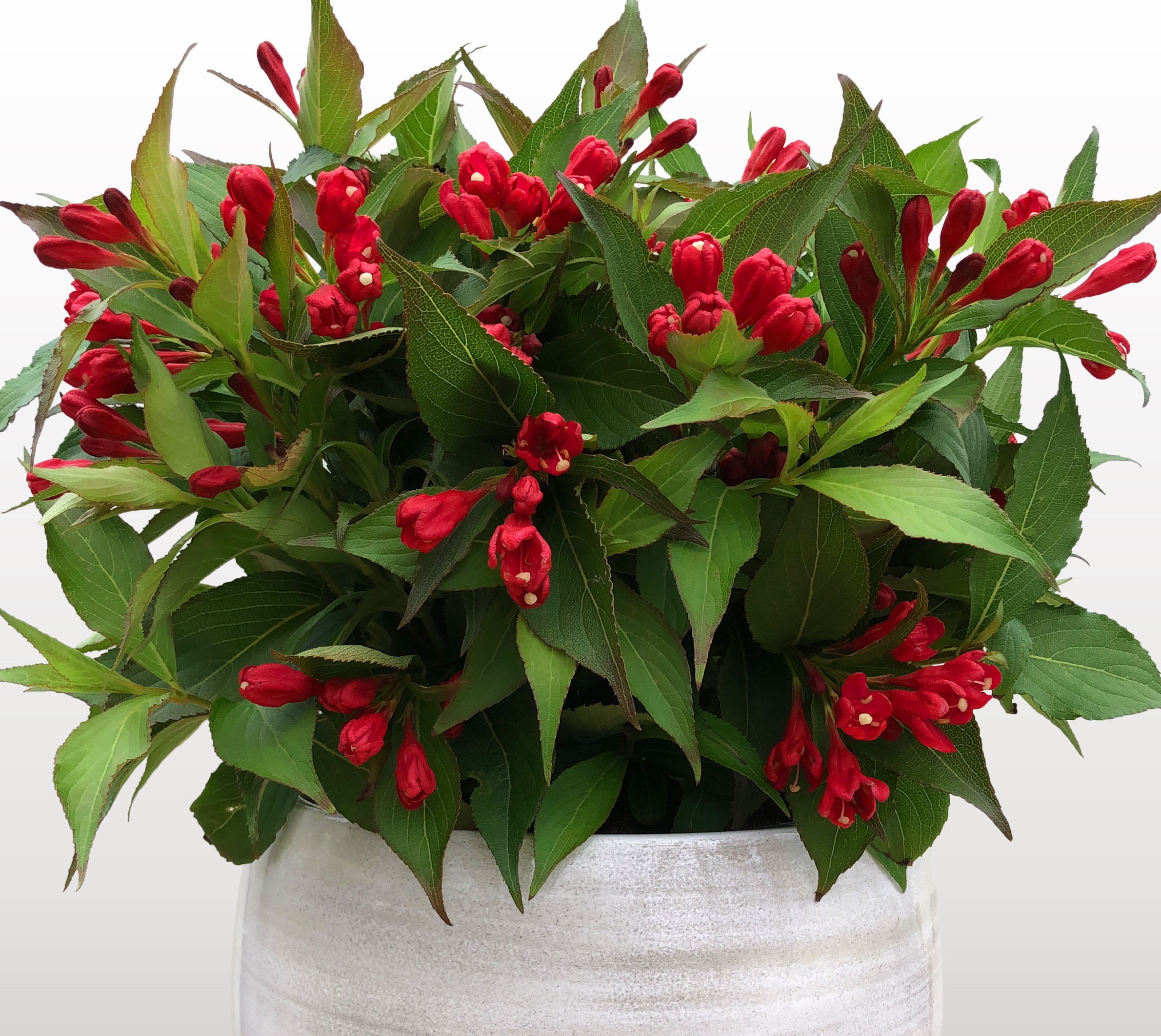 Die am stärksten wiederblühende Weigelia, Neuzüchtung von BERT VERHOEF, Boskoop; kompakt-aufrechter Wuchs von bis zu 1,5 m Höhe und Breite; im Mai überreich blühend, typisch trompetenförmige Blüten in knalligem Rot, starke Nachblüte den ganzen Sommer über bis zum ersten Frost; für das sommerliche Farb- und Blütenfeuerwerk sollte diese Sorte wie eine Rose behandelt und verblühte Blütenstände entfernt werden – ein sehr farbintensiver, pflegeleichter und vielseitig verwendbarer Kleinstrauch. Silbermedaille 2014. H, K, R, S. Zone 6a. LB 9.2.3.6. EU Gemeinschaftsmarke 017760026. Gemeinschaftlicher Sortenschutz EU 35548. Geschützte Sorte - unerlaubter Nachbau verboten!
