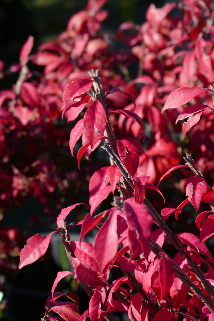 Außergewöhnliche Zwergform aus Nordamerika, Wuchs flachkugelig, ca. 80 cm hoch und 1 m breit, langsam wachsend, dicht verzweigt; Blätter eiförmig-elliptisch, fein gesägt, bis 5 cm lang mit brillant feurig-roter, lang anhaltender Herbstfärbung - die schönste kleinwüchsige Sorte mit spektakulärer bis zu drei Wochen langer Herbstfärbung, sehr anpassungsfähig und vielseitig, ideal für Farbakzente, Flächen, kleine Hecken, Pflanzgefäße. H,K,R,S,St,Z. Zone 4. LB 9.3.4.5.