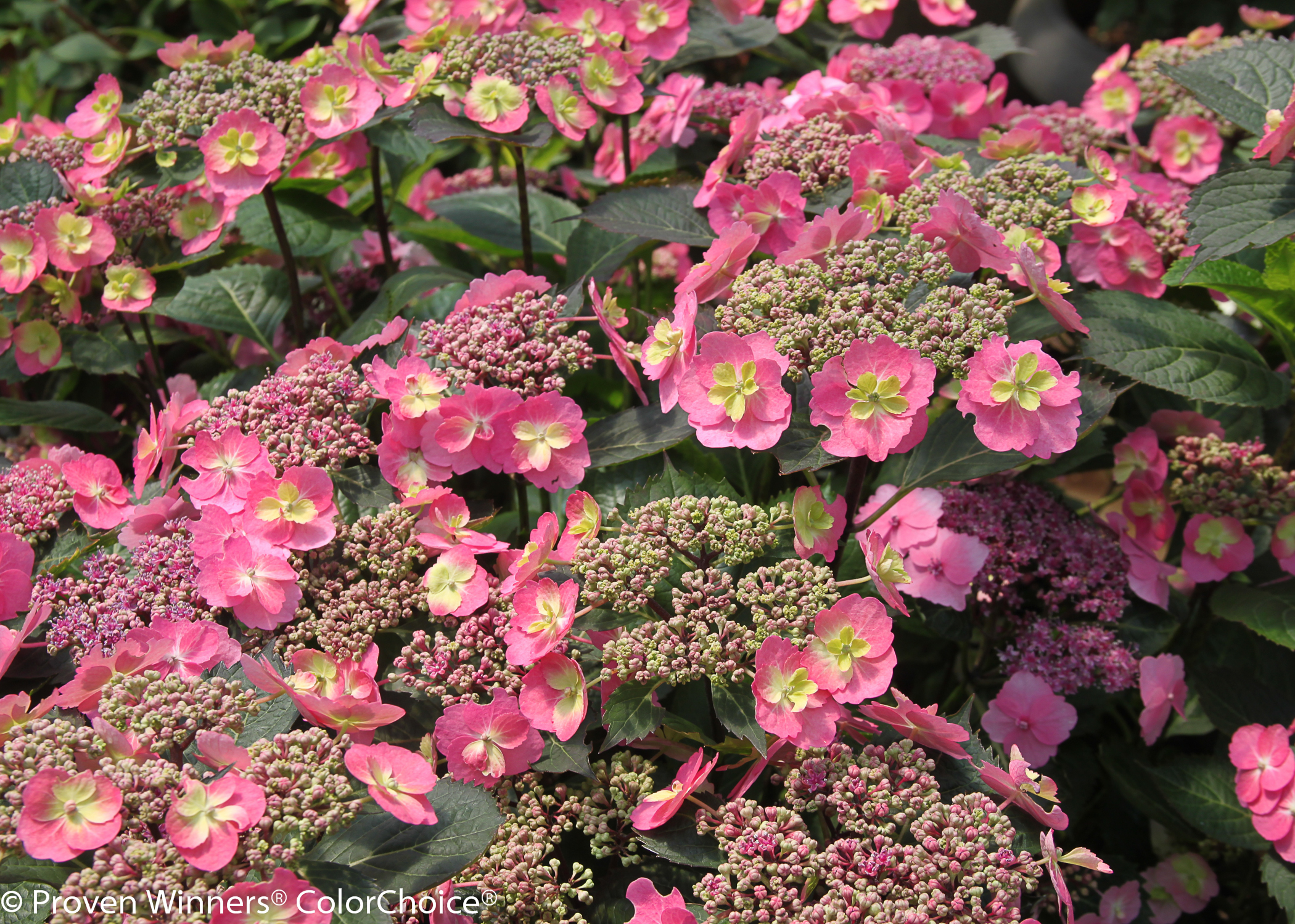 Vielversprechende Neuzüchtung von TIMOTHY D. WOOD, Spring Meadow Nursery, Grand Haven, USA; Wuchs kompakt, 60 bis 90 cm hoch und breit; Blätter dunkelgrün, gezähnt, rötlich verfärbend; Blüten steril, in Schirmrispen, am ein- und zweijährigen Holz, vom Juni bis zum Frost, rosafarben mit weiß-gelber Mitte, oder je nach Bodenreaktion blaubeerfarben mit weiß-gelber Mitte; die blau blühenden Exemplare sind auch mit der Bezeichnung ´Blueberry Cheesecake´ unter der Dachmarke ´Flair & Flavours´-Hydrangea im Handel - mit dieser schönen, reich blühenden, sehr winterharten Sorte gelang ein großer Wurf in der Bereicherung des Sortiments, attraktiv in Beet, Fläche und Pflanzgefäß, Goldmedaille auf der Plantarium Boskoop 2012. B,K,S,St. Zone 5b. LB 6.3.2.6. Gemeinschaftlicher Sortenschutz EU 40648. US Plant Patent 24820. Geschützte Sorte - unerlaubter Nachbau verboten. Original PW Sortenschutzetikett und original PW Sortenschutztopf C3 (TEKU VCG 19) - kostenlos mitgeliefert - muss verwendet werden!
