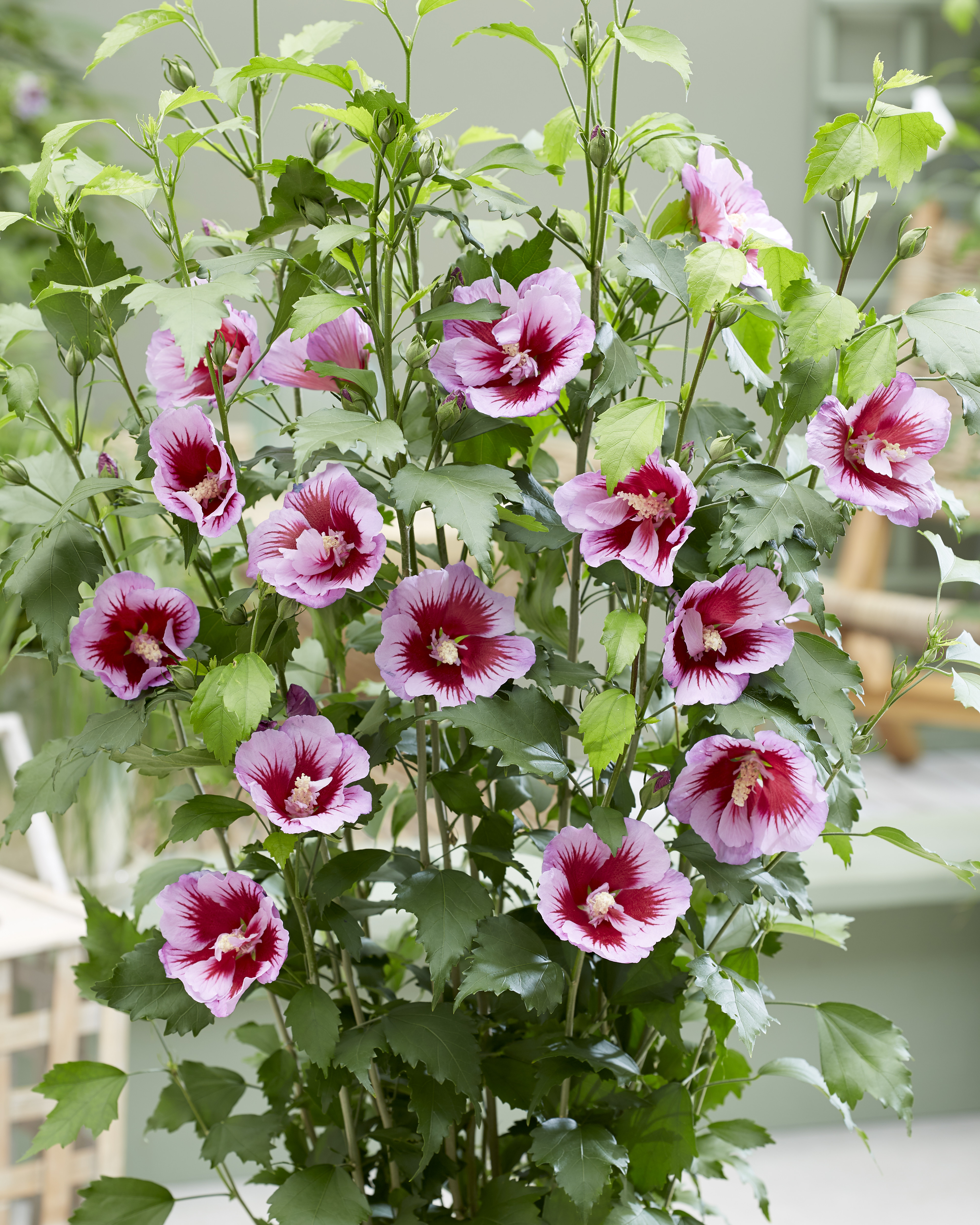 Auffallende Säulen-Wuchsform, gezüchtet von FRANCISO GANDINI, Guidizzolo, Italien; Wuchs nach zehn Jahren ca. 3,5 bis 4 m hoch, schlank und straff aufrecht, gut verzweigt; Blätter dunkelgrün; Blüten lila, mit roter, nach außen auslaufender Mitte, von Juli-September - ein beachtenswertes Novum im Hibiscus-Segment mit außergewöhnlichem, säulenförmigem Wuchs und guter Winterhärte, imponierendes, vertikales Blütenmonument für kleine Gärten, Terrassen, Eingangsbereiche, schmale Hecken, Gruppen, besondere Akzente. H, K, R, S. Zone 7a. LB 6.4.2.5. Gemeinschaftlicher Sortenschutz EU 38302. Geschützte Sorte – unerlaubter Nachbau verboten!