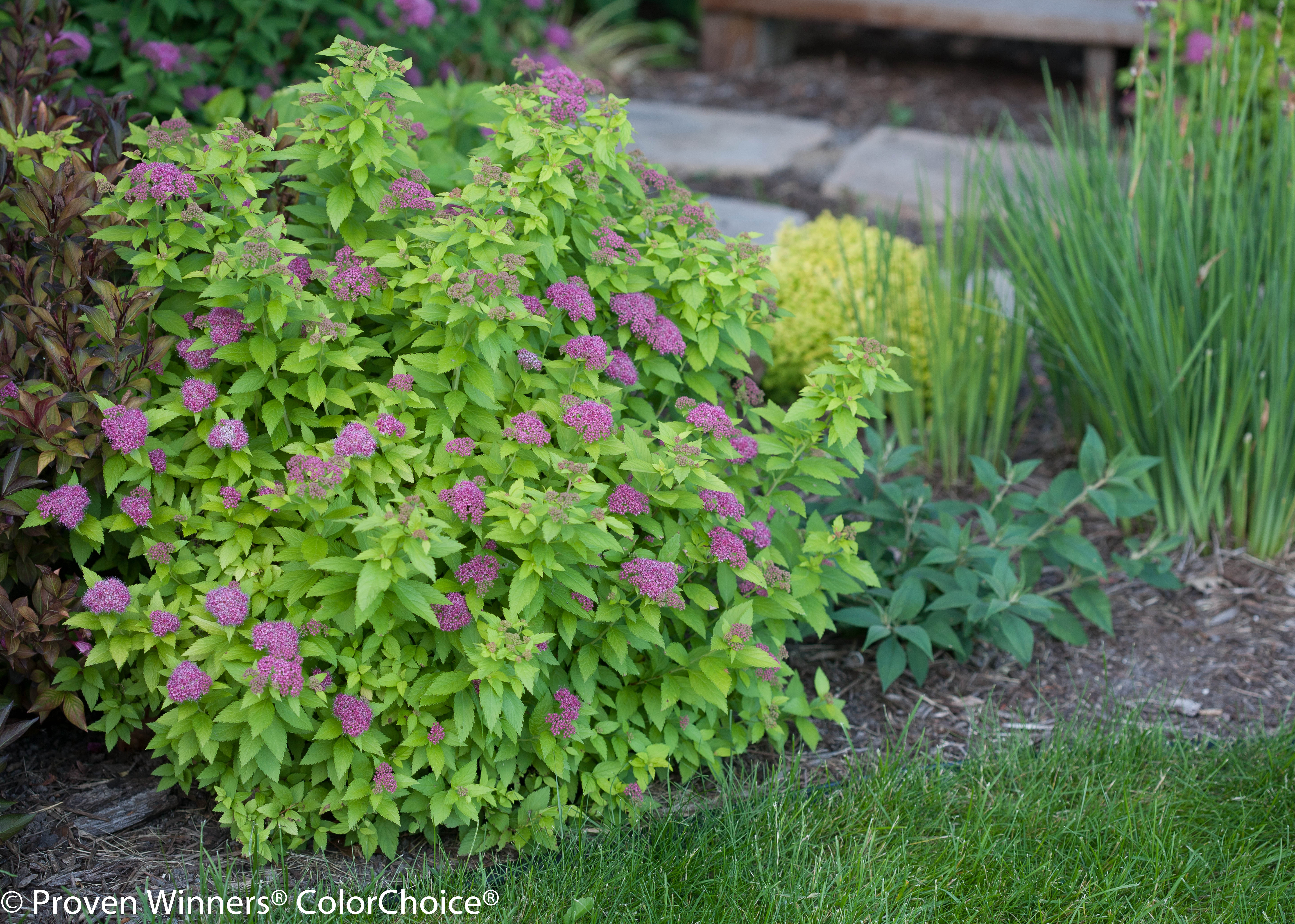 Wuchs halbkugelig, 0,45 - 0,6 m hoch und breit; Belaubung goldgelb; Blüten pink, in zahlreichen, flachen Trugdolden, von Juni bis September