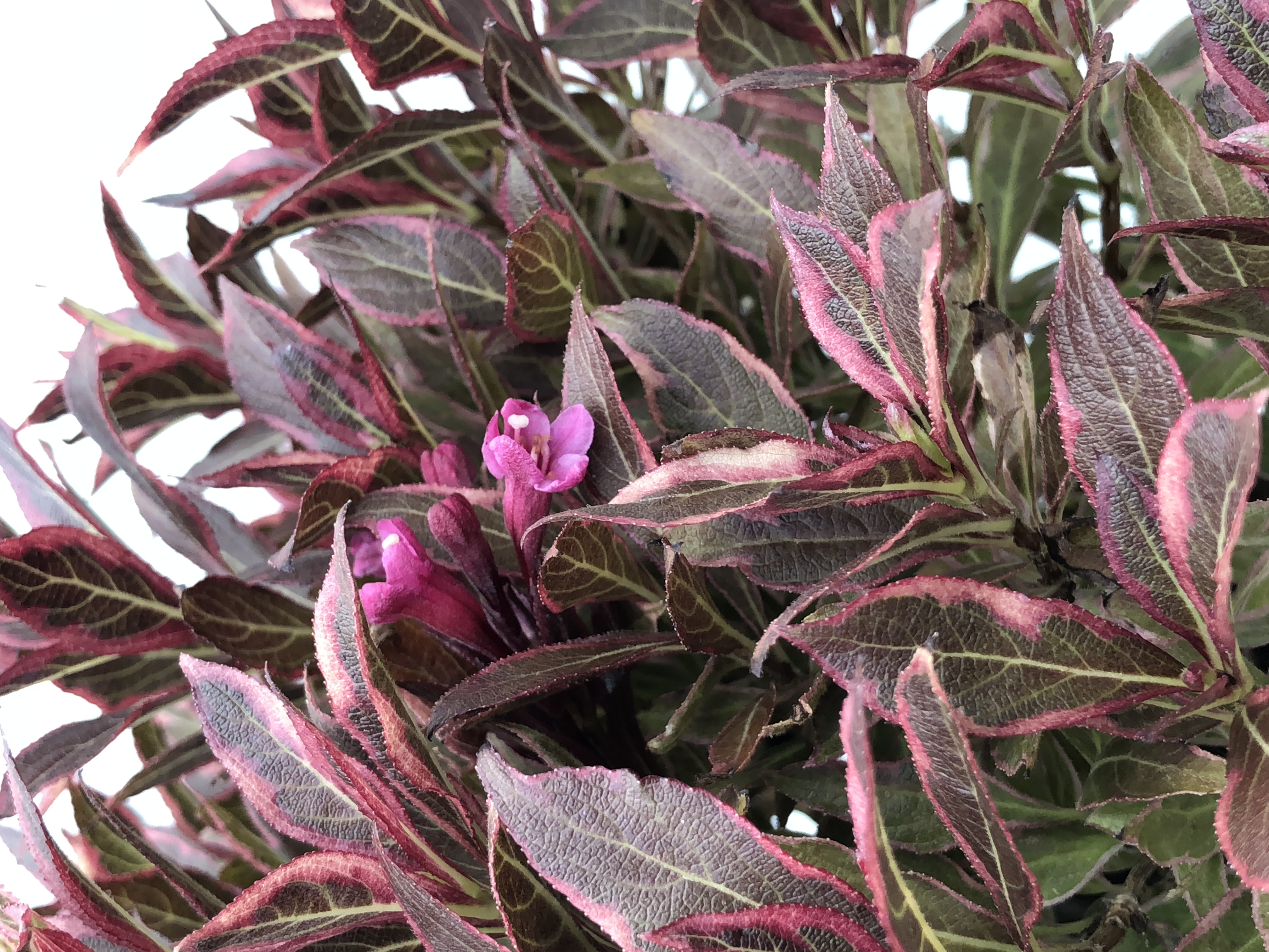 Züchtung von BERT VERHOEF, Niederlande; Wuchs halbkugelförmig, bis 60 cm hoch und breit; Blätter grün, weiß-rosa gerandet, im Herbst rot-violettbraun, creme-rosa gerandet; Blüten trichterförmig, lila-pink mit weißen Staubgefäßen - über den ganzen Sommer attraktives Gehölz für kleine Gärten, Flächen, Hecken, Pflanzgefäße, Balkon, Terrasse, mobiles Grün. H, K, S, Z. Zone 5b. LB 9.3.2.6. EU Gemeinschaftsmarke 017760026. Gemeinschaftlicher Sortenschutz angemeldet EU 20182671. Geschützte Sorte - unerlaubter Nachbau verboten!