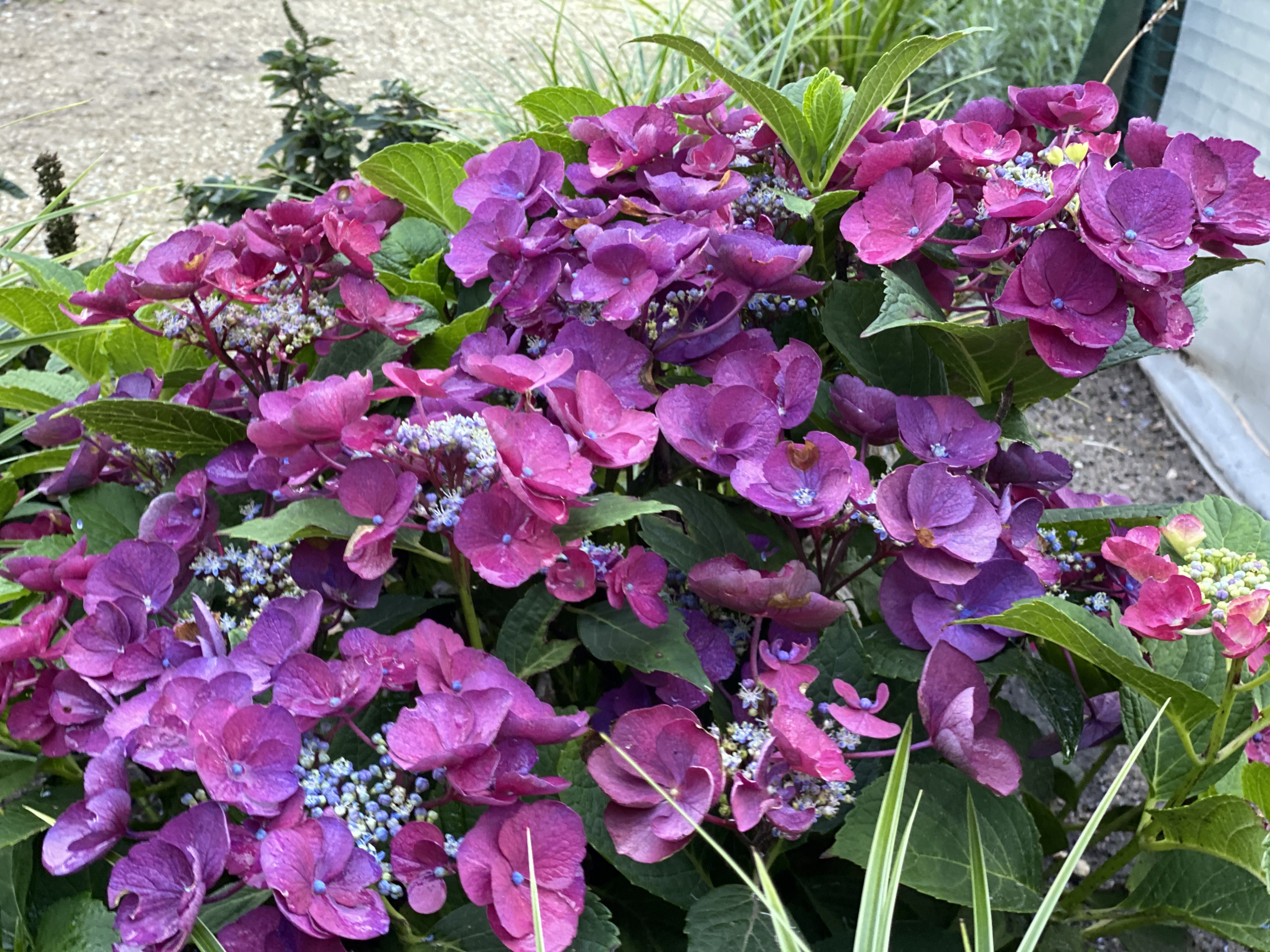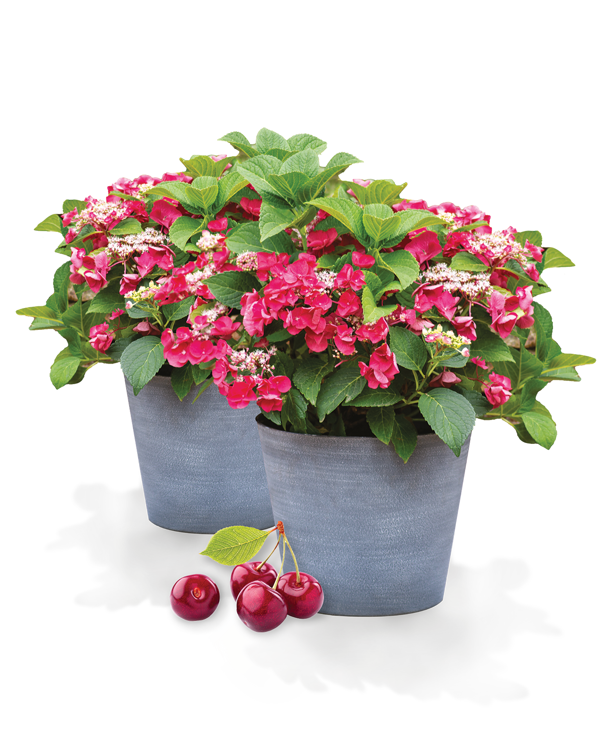 Außergewöhnlich winterharte Selektion (Zone 4!) von MCKAY Nurseries, Waterloo, Wisconsin, USA; Wuchs kompakt, 0,9 bis 1,2 m hoch und breit; Blätter grün, im Herbst burgunderrot; Blütendolden mit zahlreichen kirschroten, sehr großen, sterilen Randblüten, in der Mitte kleine, sternförmige, rosa Blüten, in sauren Böden wechseln die Blütenfarben zu lavendel oder violett - eine sehr winterharte und reichblühende Selektion mit einmalig schöner Blütenfarbe. H, K, S, St. Zone 4b. LB 2.1.5.6. US Plant Patent 28757.