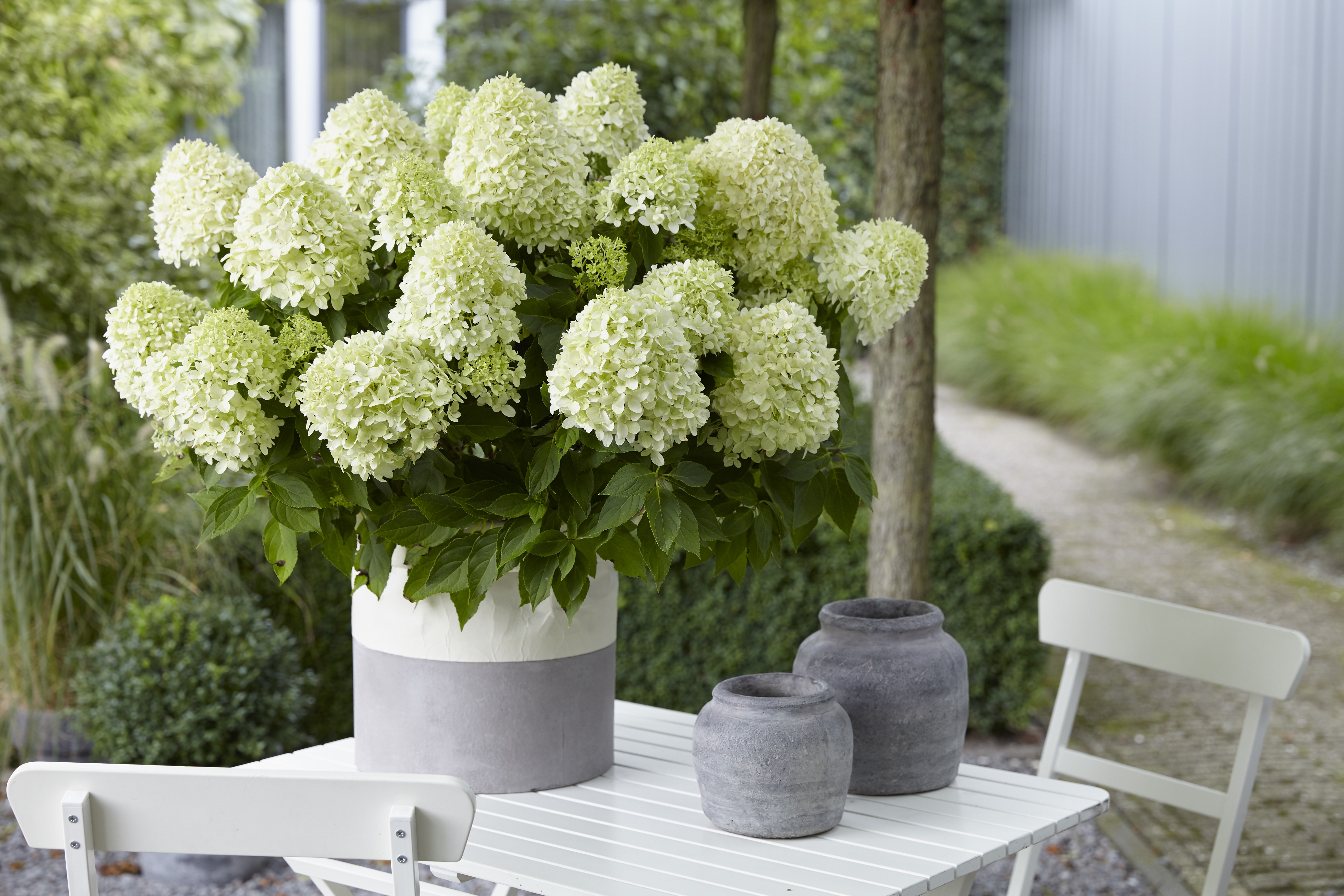 Sehr schöne, kompakte Zwergform, gezüchtet von GUIDO ROUWETTE, Valkenburg, Niederlande; Wuchs gedrungen, nur 50 cm hoch und 30 cm breit; große, cremeweiße, volle, rundkegelige Blütenrispen - eine ideale, winterharte Topfpflanze für Terrasse oder Balkon, Eingangsbereiche, Beete, Rabatten, Flächen und kleine Hecken. H, K, S, St, Z. Zone 5a. LB 2.1.5.6. Gemeinschaftlicher Sortenschutz angemeldet EU 20180972. Geschützte Sorte - unerlaubter Nachbau verboten!