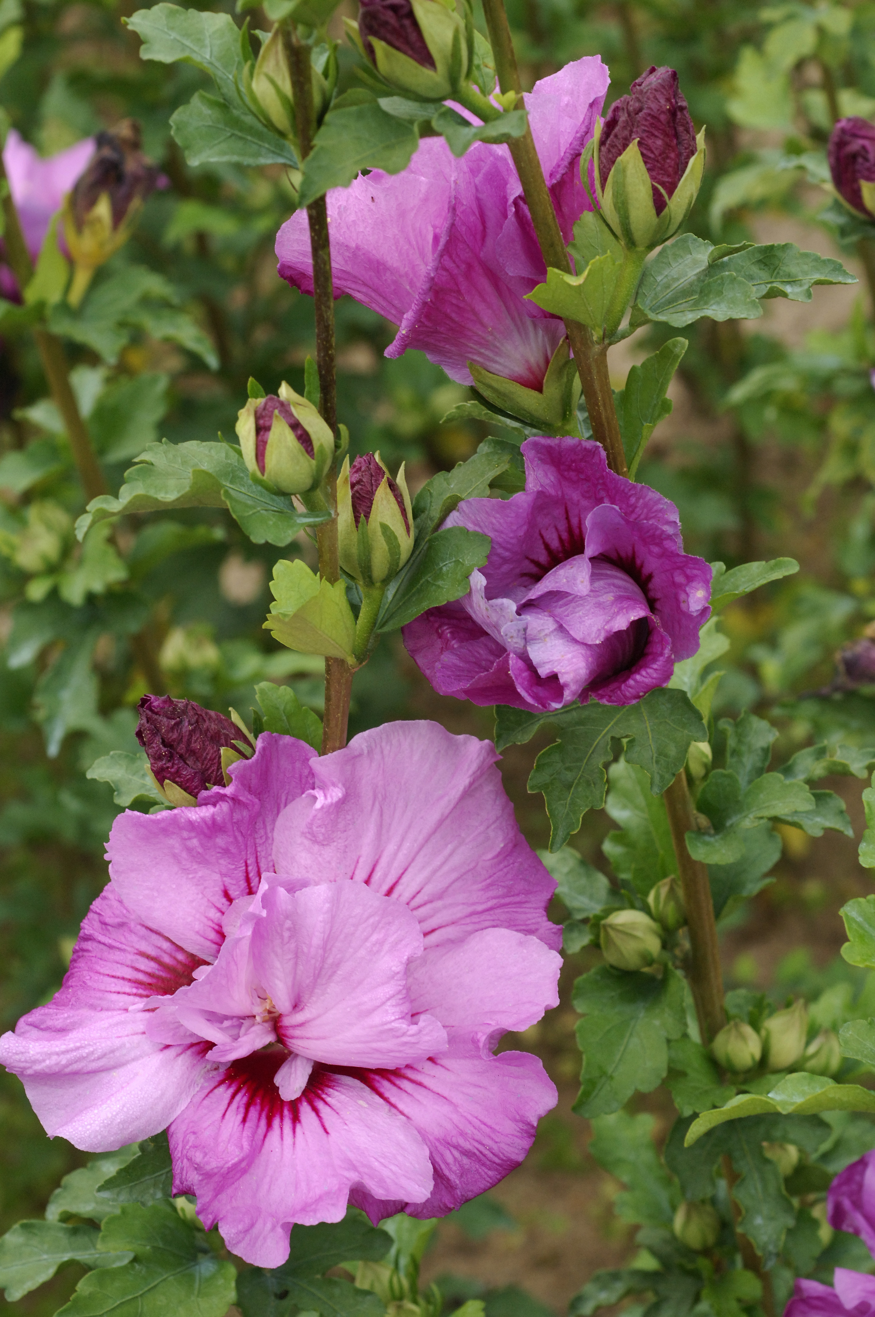 Selektion der Baumschule MINIER, Angers, Frankreich; Wuchs schnell, mehrtriebig, straff aufrecht, bis 3 m hoch und 2 m breit; Blüten halbgefüllt, tief rosa-violett mit dunkelrotem, ausstrahlenden Basalfleck, Anfang Juli bis Ende September - eine auffällige Sorte im mittelhohem Sortiment, für Garten und Pflanzgefäße. H, K, R, S. Zone 7a. LB 6.4.2.5. FIRST EDITIONS® Selektion von Bailey Nurseries Inc., St. Paul, MN, USA. EU Gemeinschaftsmarke 007580335 und 018158758. Gemeinschaftlicher Sortenschutz EU 23097. Geschütze Sorte, unerlaubter Nachbau verboten!