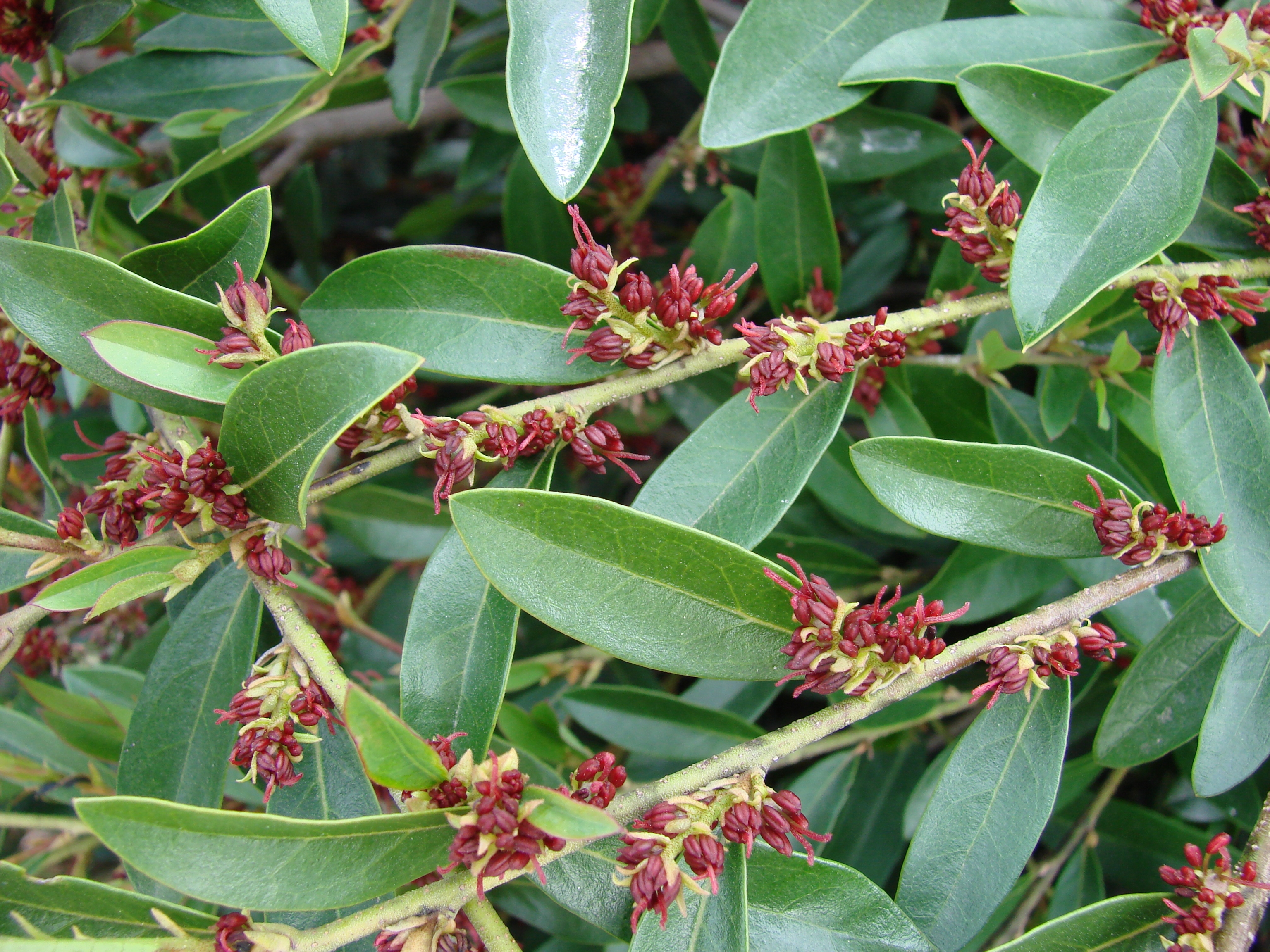 Growth branched, spreading, ca. 0.90 m high and 1.50 m wide; shoots cascading overhanging; leaves lanceolate, alternate, thick, leathery, with entire margins, bronze-purple when shoots, later blue-green frosted; Flowers small, burgundy to reddish-brown, in short racemes on the leaf axils of the previous year's branches, in March to May - this attractive, evergreen, robust, pruning-, heat- and drought-tolerant woody plant is disease-free, has no special soil requirements and will gain more importance in areas down to -15° C in the future. For areas, planters, and wherever low-maintenance small evergreen shrubs are desired in the garden and landscape. B, K, S, St. Zone 7a. LB 7.4.4.6. FIRST EDITIONS® selection by Bailey Nurseries Inc, St. Paul, MN, USA. US Plant Patent 253128. EU Community Trademark 007580335. Variety trademarked!